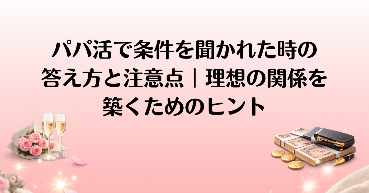 パパ活を始めると、「条件を聞かれた時、どう答えればいいのか?」と悩むことがよくありますよね。金銭的なことや、感情面での期待に対する不安が大きくなることもあるでしょう。しかし、条件を上手に伝えることで、相手との関係がスムーズに進み、理想的なパートナーシップを築くことができます。このガイドでは、パパ活で「条件を聞かれた時」にどう答えるべきか、そして良い関係を築くために押さえておきたいポイントを徹底解説します。自分の価値観をしっかり伝え、相手とのコミュニケーションを円滑に進めるための方法を学んでいきましょう。