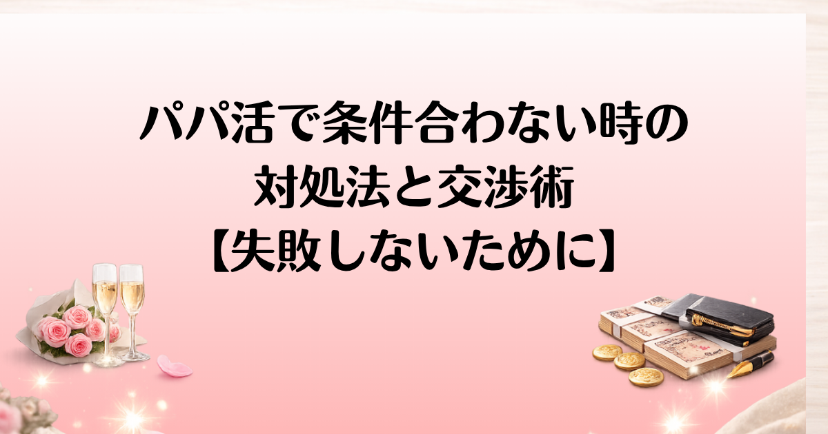 パパ活を始めてみたいけど、「条件が合わない」と感じることはありませんか?初めてパパ活を行う場合、金銭的な条件や関係の深さに不安を感じるのは当然です。特に、相手が自分の条件を明確にしてくれない場合、どう進めていけば良いのか分からず、悩んでしまうこともあるでしょう。この記事では、パパ活で条件が合わない場合の原因や、その対処法、交渉術について詳しく解説します。条件を言わない相手とどう関係を進めるべきか、信頼関係を築くための方法なども紹介していきますので、安心して次のステップに進めるように、ぜひ参考にしてください。