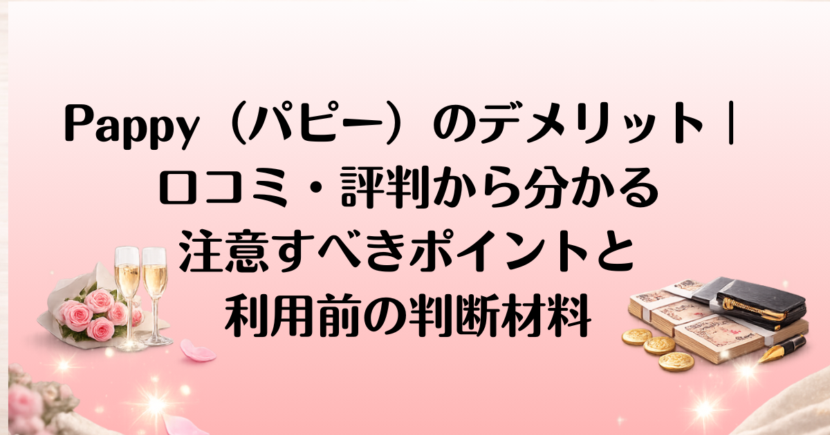 Pappy(パピー) は、高収入男性との出会いをサポートする パパ活マッチングアプリ として注目されていますが、実際に利用する前に気になるのは デメリット です。特に、 料金が高め だという声や、 会員数が少ない ことによる 出会いの難しさ、そして 地域差 が影響する マッチング率の低さ など、実際に体験したユーザーからのフィードバックを基にした評価が気になるところです。この記事では、Pappy を利用する前に知っておきたい デメリット を 口コミ・評判 を参考にしながら解説し、 料金体系や使い方、さらに どんな人に向いているか についても触れていきます。出会いをスムーズに進めるための 注意点 と 改善策 をしっかり押さえて、自分に合った使い方を見つけましょう。