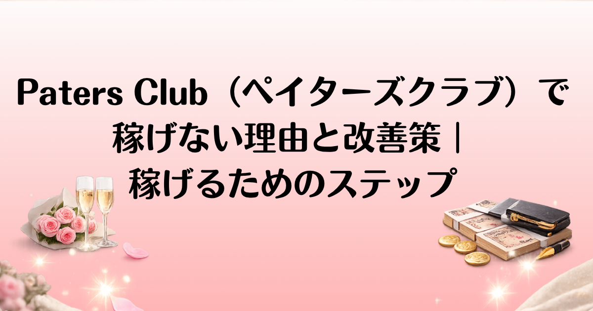 パパ活アプリ「Paters Club(ペイターズクラブ)」を利用しているものの、なかなか思うように稼げないと感じている方も多いのではないでしょうか。実際、Paters Club(ペイターズクラブ)には多くの特徴がありますが、なぜ稼げないと感じることがあるのでしょうか?この記事では、「Paters Club(ペイターズクラブ)で稼げない理由」とその改善方法について詳しく解説します。また、他のマッチングアプリとの比較も行い、どのようにPaters Clubを最大限に活用できるのか、成功事例やアプローチ方法を通して学べるポイントを紹介します。稼げるようになるためのステップを押さえて、次の一歩を踏み出していきましょう。