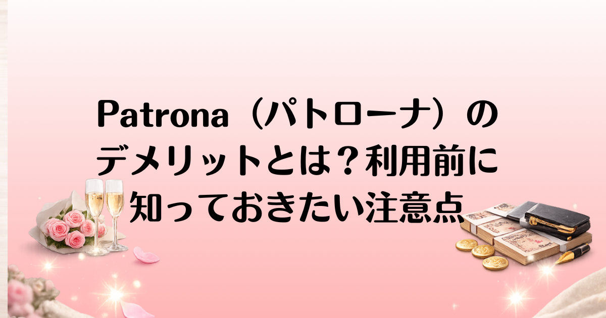 Patrona(パトローナ)は、パパ活を目的とした人気のマッチングアプリの一つですが、実際に利用する前に知っておくべきデメリットもいくつか存在します。本記事では、Patrona(パトローナ)のデメリットを徹底的に解説し、料金や会員数、マッチング率に関する課題を紹介します。また、実際の利用者の口コミをもとに、サービスの欠点を克服するためのコツや改善策もご紹介。利用前にしっかりと理解して、賢くサービスを活用するための参考にしてください。